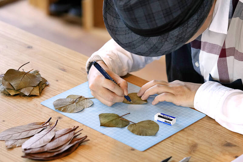 First, he outlines the design on the leaf with a pen in his right hand. Then he takes a design knife in his left hand and starts cutting the leaf carefully. Slowly, the leaf begins to take the shape of a frog carrying an umbrella — a simple design he recently demonstrated.
