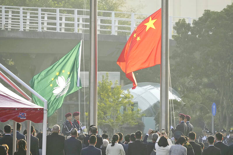 Macao yesterday marked the 25th anniversary of its return to Chinese rule. Chinese President Xi Jinping (習近平) is visiting the city for three days and the city is festooned with celebratory banners and other decorations. A fireworks display is planned for next week.