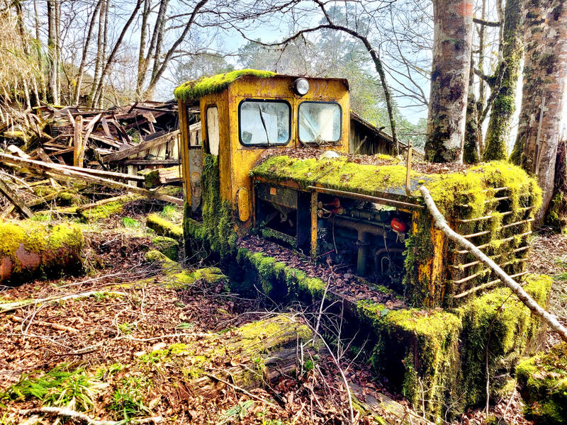 Along the main tracks as you walk in are the buildings where people did their work at Lanshan. On the left are three partially collapsed buildings — the locomotive shed, the power plant and the lumber processing station — and a still-intact fueling station. Several locomotives are scattered in and around these buildings, still sitting on the rails where they were parked on their last working day back in 1989. Less than four meters long, with their cabs covered in flaking yellow paint and the rest in a layer of moss, these tiny logging locomotives are among the most photogenic relics at Lanshan today.