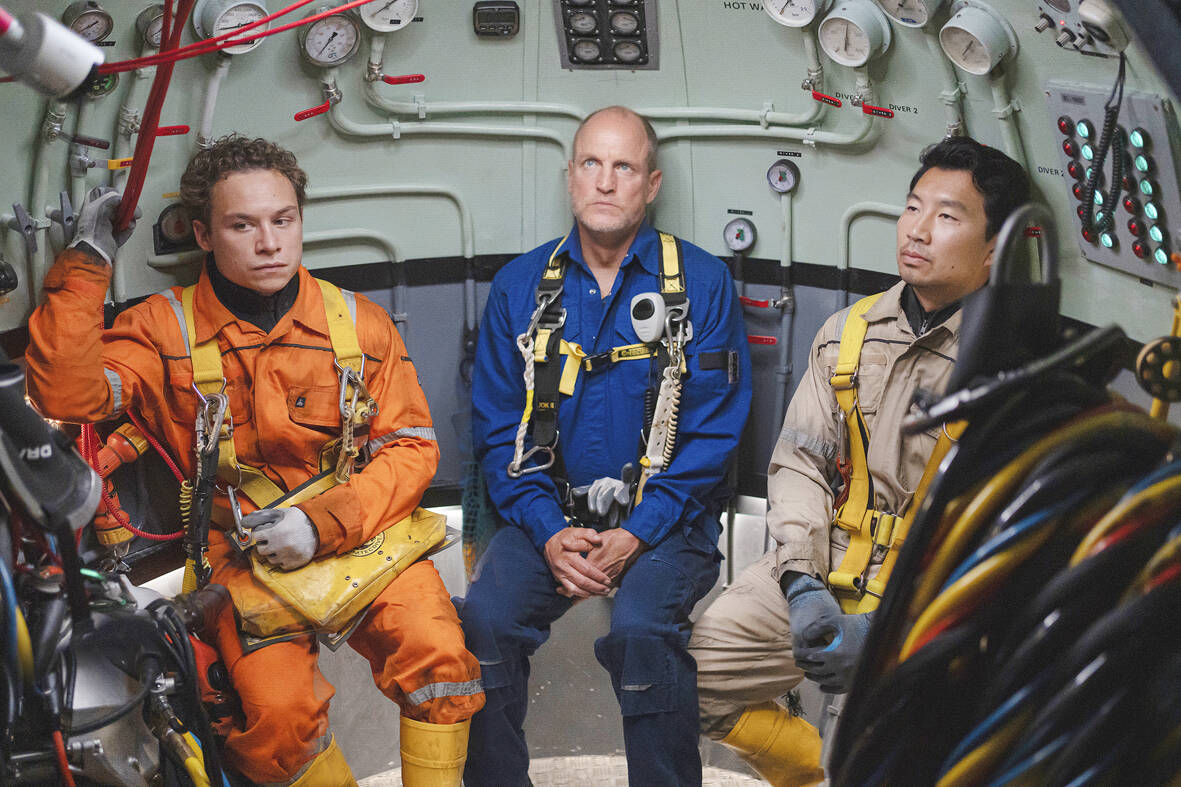 If merely reading this is giving you heart palpitations already, you can only imagine the white-knuckle experience of watching this all play out on the big screen. It’s 40ish minutes of pure suspense and anxiety as the story shuffles between the man at the bottom of the ocean, Chris Lemons (Finn Cole), his fellow saturation divers (Woody Harrelson as Duncan and Simu Liu as Dave) in the diving bell below the waters who are unable to help and the crew in the support vessel above (including Cliff Cutris and Mark Bonnar) scrambling to get their systems back online and operational as the clock rapidly runs out. Ten minutes has never felt so short — and then it just gets worse as the clock starts counting up, showing Chris’s time without oxygen.