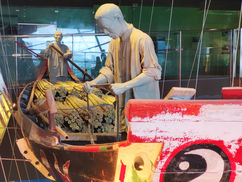 When this proved successful, others started to imitate their method, eventually piling as many as 12 small bamboo rafts onto one large boat. When they arrived at their designated fishing area, the one-man rafts would be launched and spread out, dramatically widening the area they could cover. One of these piggybacking rafts, known in Hoklo (more commonly known as Taiwanese) as tiotsoa (釣槽仔), has been set up in the museum to look as if it is in the middle of a day of fishing, suspended a meter above the floor and loaded with the necessary equipment.