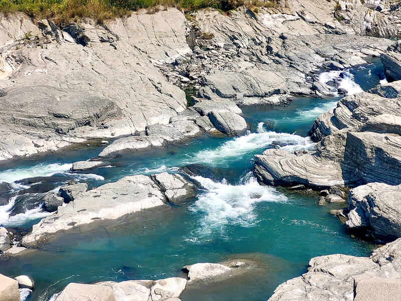 After leaving the tunnel, the path crosses the Dajia River (大甲溪) on a photogenic 382 meter steel bridge built in 1908. The clear blue water and white rapids contrast beautifully with the bare grey stone over which they run.