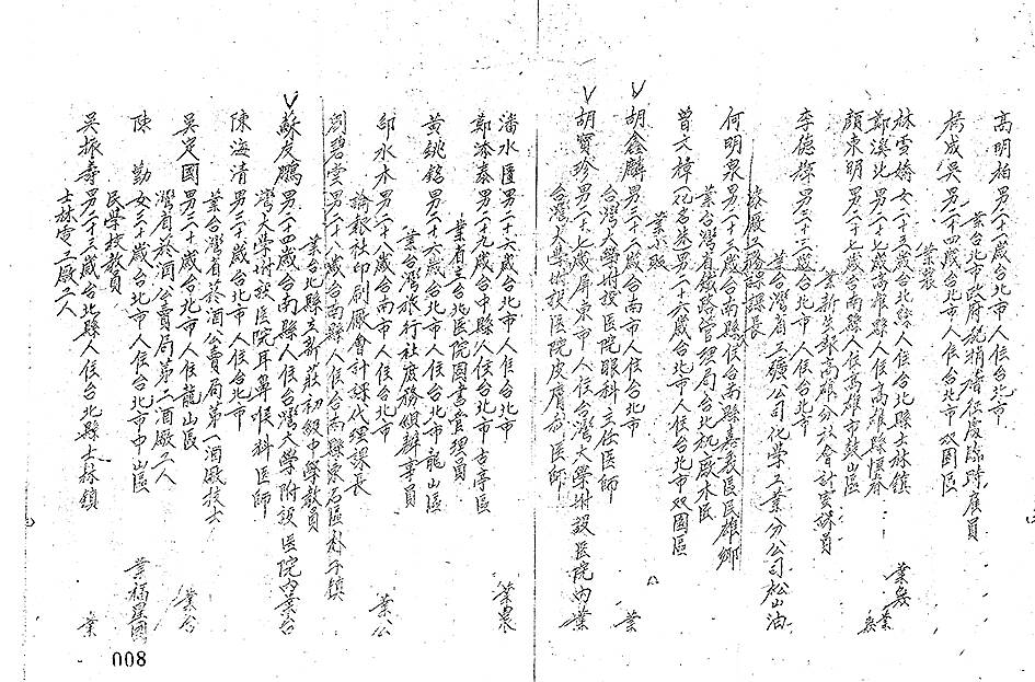 Hu Hsin-lin, who was older and more experienced, was put in charge, and Su says that he and Hu Pao-chen, along with Qishan Hospital surgeon Lin En-kui (林恩魁) and Keelung Hospital gynecologist Wang Ching-shu (王荊樹) also took over at times. Pediatrician Chen Shen-fu (陳神傅), internists Lu Shui-ke (呂水閣), Hsu Shui-chuan (徐水泉) and Hsu Yao-lung (徐耀龍), and dentist Lin Hui-chi (林輝記) rounded out the roster, and also helping out were NTU medical student Yen Shih-hung (顏世鴻), two National Defense Medical Center students as well as several prisoners who had nursing training.