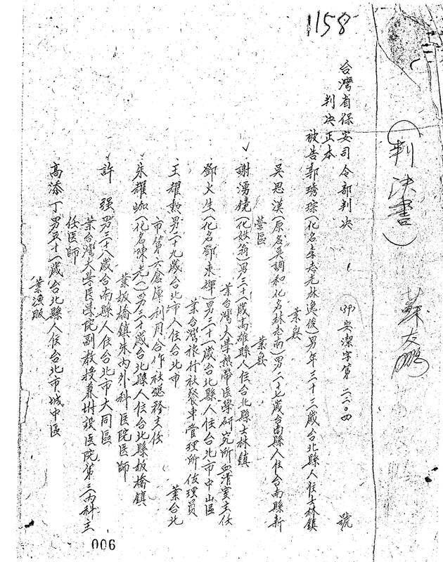 He saw several burly men who appeared to be government secret agents, and three other resident doctors: internist Hsu Chiang (許強), dermatologist Hu Pao-chen (胡寶珍) and ophthalmologist Hu Hsin-lin (胡鑫麟). They were handcuffed, herded onto two jeeps and taken to the Secrecy Bureau (保密局) for questioning.