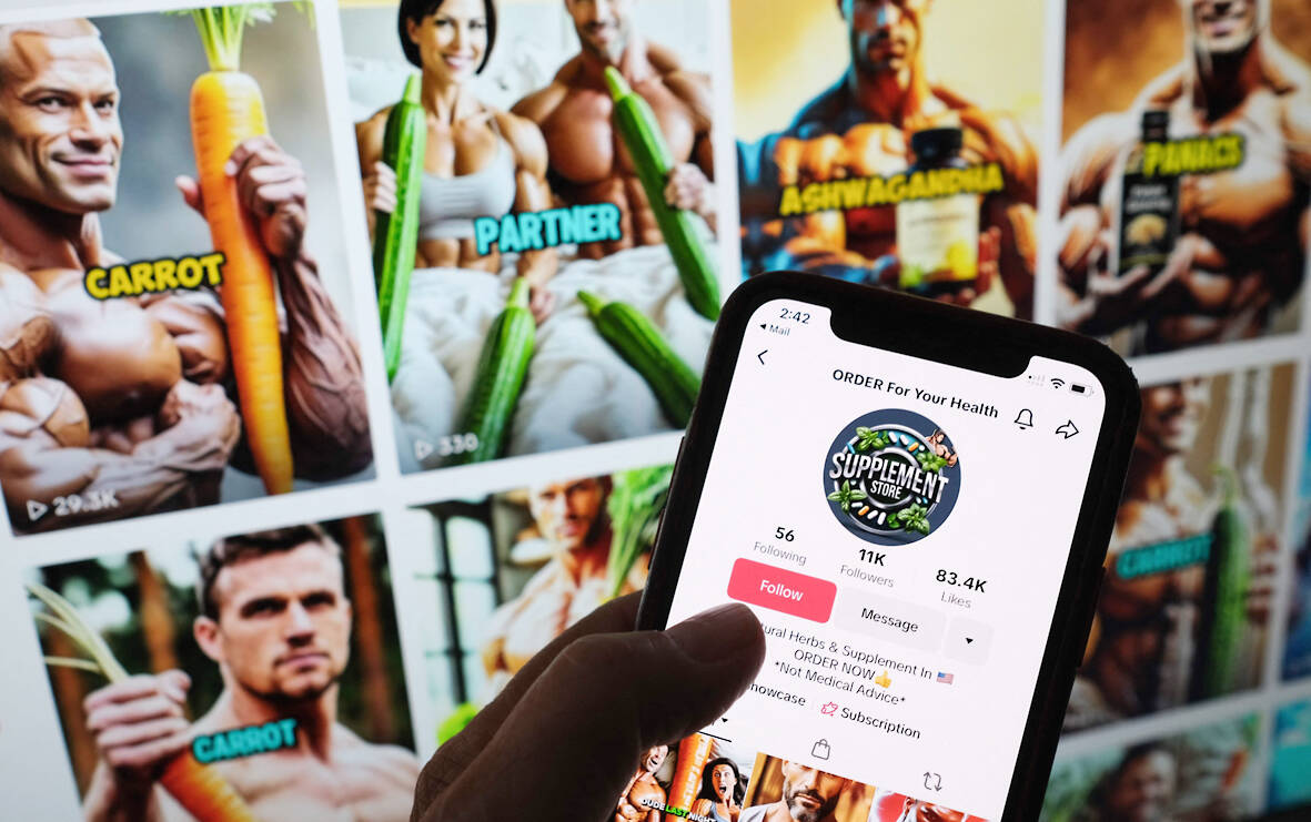 Holding an oversized carrot, a brawny, shirtless man promotes a supplement he claims can enlarge male genitalia — one of countless AI-generated videos on TikTok peddling unproven sexual treatments.