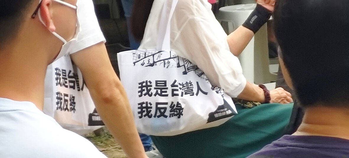 Though Republic of China (ROC) flags were present, there were far less than at a KMT rally, marking one difference between the supporters of the two parties. Bags reading “I am Taiwanese, I oppose (the pan-) greens” had been dispersed, and many proudly carried.
