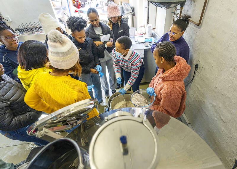 After pouring brown, gritty liquid from a huge silver tank into a flute-like container known as a refractometer, South African beer brewing master Apiwe Nxusani-Mawela gives an expert nod of approval and passes it around to her students, who yell their observations with glee.