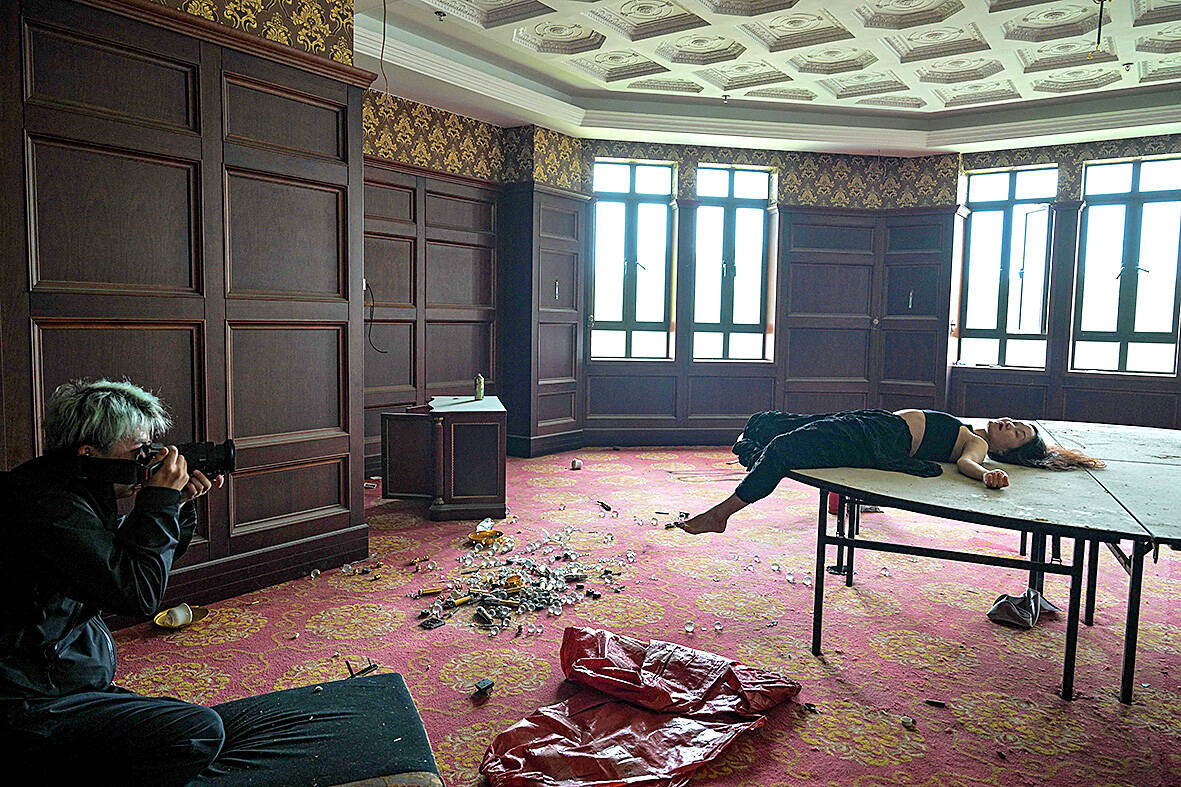 From the outside, the hotel looked like a prefabricated medieval castle. Once inside, it was clear the property had been abandoned for years. Searching through the rooms for good spots for striking photos, Xu and his friends came across remnants of the hotel’s past — a mahjong table, laundry sheets and piles of dinner plates. Props from past photoshoots were scattered on the floor and on one ballroom wall, “Long Live Chairman Mao” was written in spray paint.