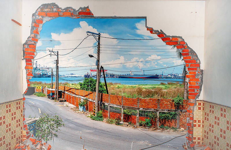 On an adjacent wall, far from the mailboxes of Parisian social housing, is a wall-sized image of what used to be the view from a home, looking out to Kaohsiung’s port. Chen Po-I’s (陳伯義) photograph is not a view from a window, but a wall that has been removed, the rubble of red bricks framing the scene, highlighting the tension between development and the destruction it inevitably brings. The house used to be in the village of Hongmaogang (紅毛港), a once-thriving fishing community that faced decades of issues caused by industrial development and pollution before residents were eventually relocated and the village partially destroyed.