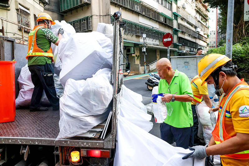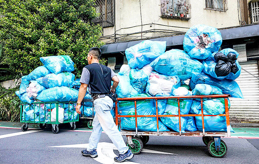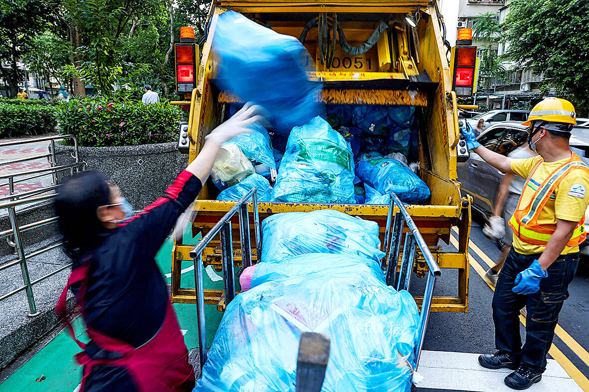 The trucks operate five days a week, usually in the late afternoon and evening. Yang Xiu-ying, 76, has made a living out of helping her neighbors dispose of their garbage. She receives NT$11,200 (US$380) a month from 28 households in her lane to sort their trash, load it onto a trolley and take it to the refuse trucks.