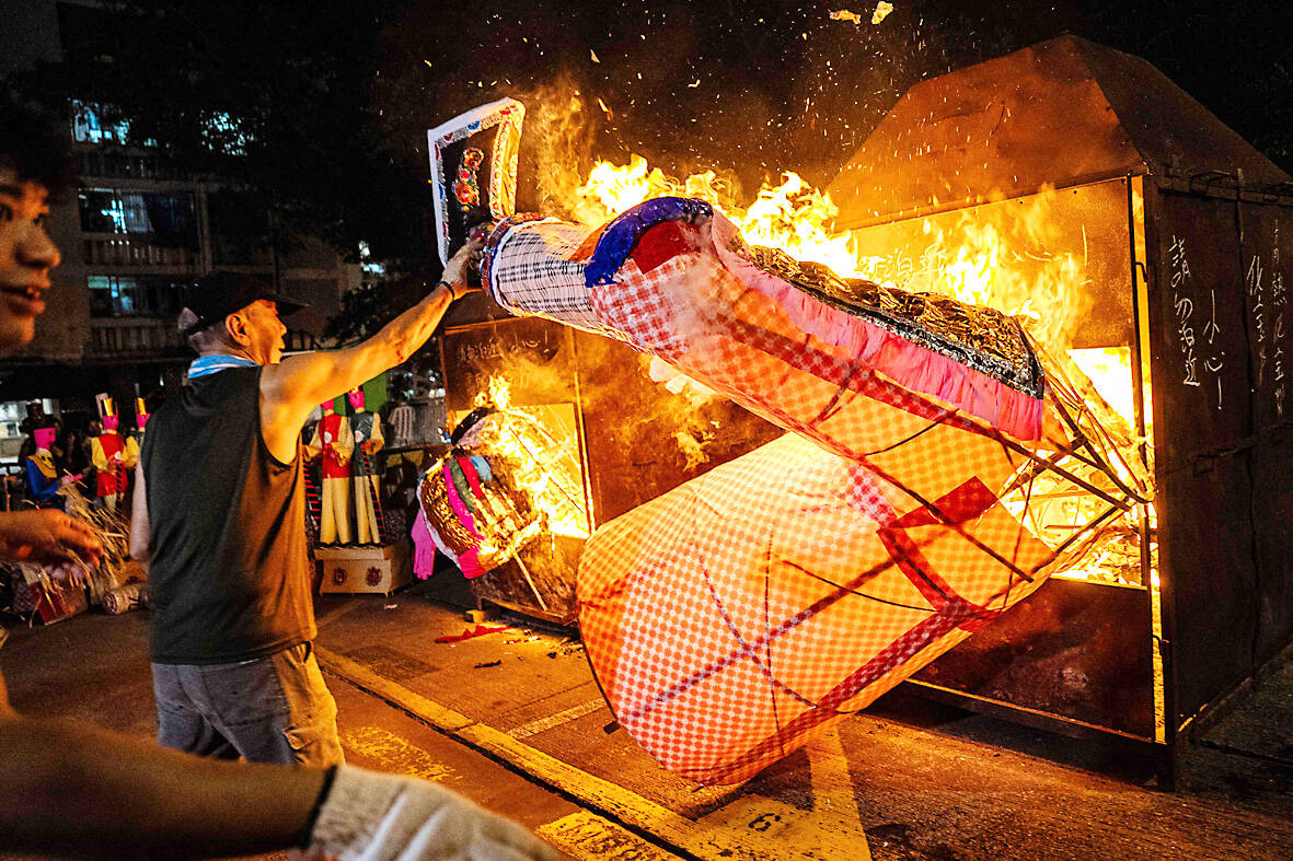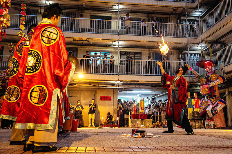 Eyes glowing red, the towering “ghost king” presided over the atrium of a Hong Kong housing block on Sunday as residents performed age-old rituals — a scene that may become history as redevelopment looms.