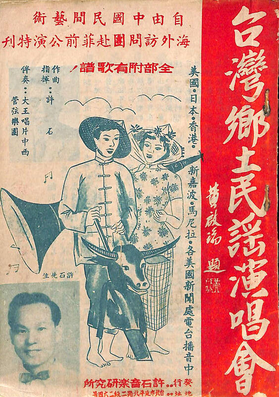 In the summer of 1947, Hsu and future star Wen Hsia (文夏), then a high school student, traveled to Pingtung County’s Hengchun Township (恆春). He asked the guesthouse owner for someone who could sing the folk epic Melody of Memory (思想起), and soon, the legendary wandering bard Chen Ta (陳達) showed up with his moon lute. This was two decades before musicologists “rediscovered” Chen and made him a household name (see “Taiwan in Time: Searching for their ‘musical mother tongue,’” Feb. 9, 2020).
