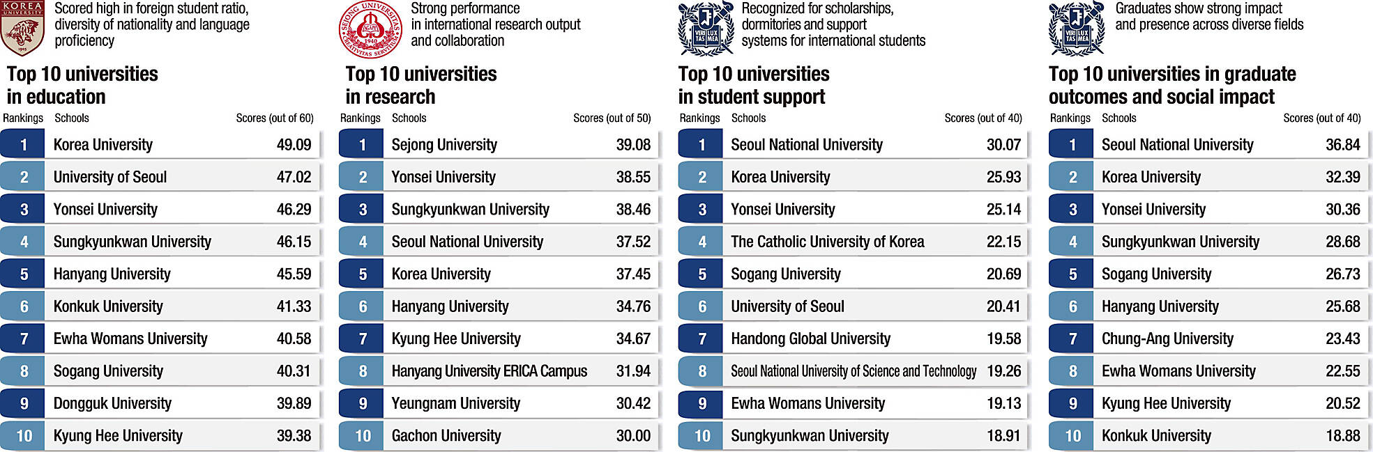 In the overall rankings, Korea University secured first place with a total score of 144.86, followed by Seoul National University (141.48) and Yonsei University (140.33). Rounding out the Top 10 were Sungkyunkwan University (132.20), Hanyang University (124.83), Sogang University (112.27), University of Seoul (111.10), Ewha Womans University (110.40), Kyung Hee University (108.53) and Dongguk University (101.43).