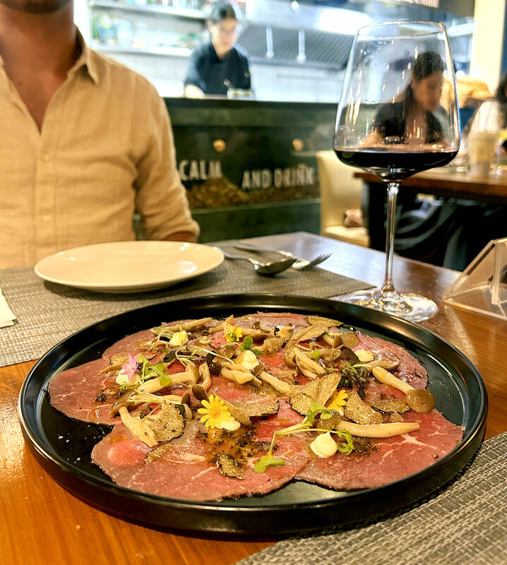 We lap up our very enthusiastic waiter’s recommendations and start with the Carne Cruda al’Albese (NT$520), round slices of fleshy raw beef topped with wild mushrooms, generous shavings of black truffle and edible flowers.