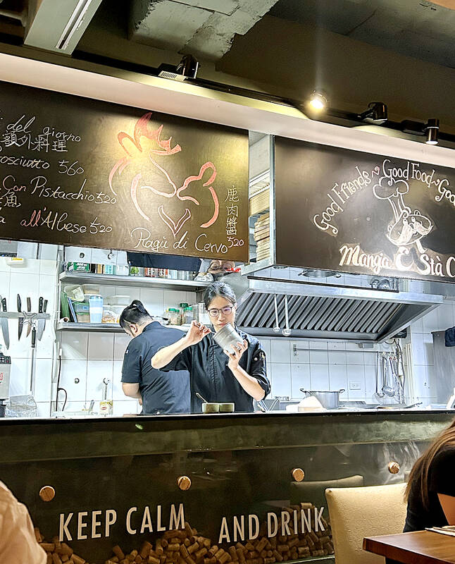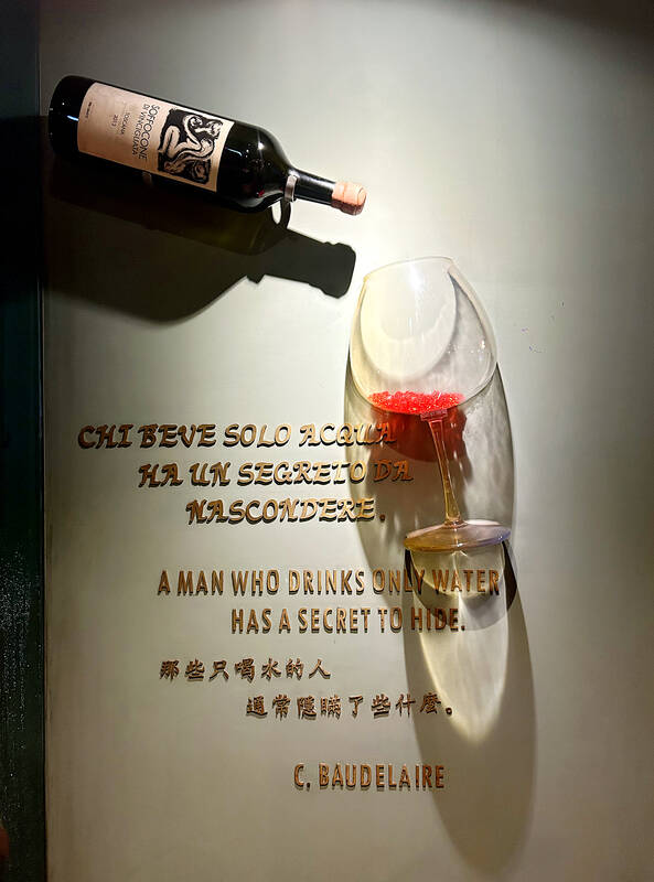 The wine menu is extensive and our waiter Laurence is knowledgeable, allowing us to try two house wines sold by the glass. We opt for two glasses of the drier Corvina Veronese (NT$250) that go down a treat.