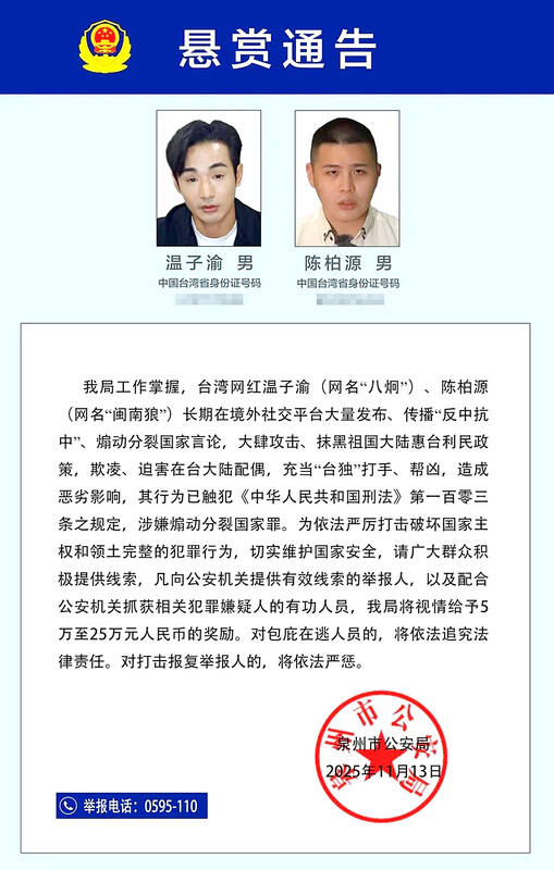 Police in Quanzhou, a port in Fujian Province, earlier this month issued arrest notices for two Taiwanese influencers, Wen Tzu-yu (?子渝) and Chen Po-yuan (陳柏源). A bounty of US$35,000 was posted for assistance in obtaining their arrest. The two influencers had aroused Beijing’s ire after exposing how Beijing pays Taiwanese influencers to spread its disinformation. One of the pair brilliantly trolled the PRC by “turning himself in” to the police in Tainan, where the PRC has no jurisdiction.