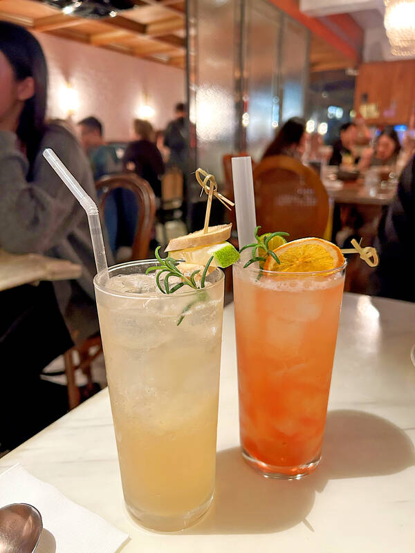 We also grab a “Lover’s Gaze: Sipping Aiyu Jelly,” (NT$380) with gin, Cointreau, kumquat and honey, with chewy blocks of aiyu jelly you sip up through a boba tea straw. This was a cool idea, but a little bitter, and too much Cointreau turned the taste to pure margarita for me.