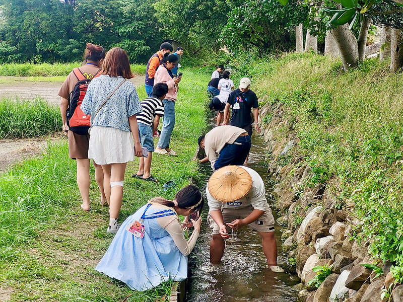 We then stepped into a narrow ditch where crystal-clear water from the Longshuei spring first starts flowing downhill. Digging in the sand at the bottom, our guide pulled up a variety of river snails that prefer this pristine environment. The rest of us managed to find a few on our own, but could not match the skill of our guide. This clean water source free of pesticide contamination is also the reason farmers are able to grow organic rice here.
