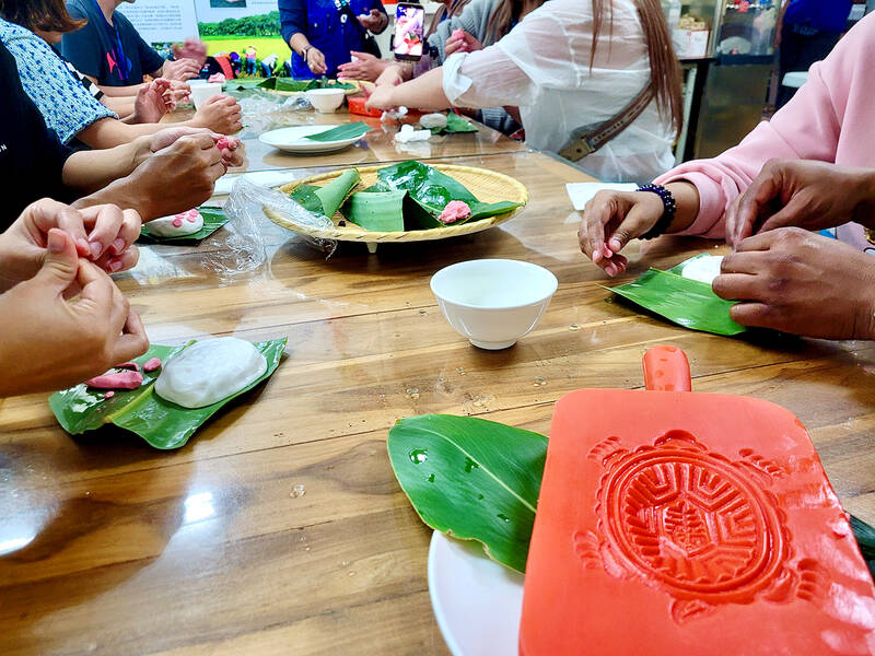 We were taught about the different types of rice and their uses, and guided in making our own red turtle cakes (紅龜粿). Then, as the cakes were being steamed, we went for a walk outside, where our guide identified nearly every plant we passed and something interesting or useful about it. We tasted several edible seeds growing on what appeared to the untrained eye as simply roadside weeds, and had fun blowing on an empty seed pod to produce an ear-splitting whistle.