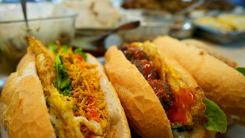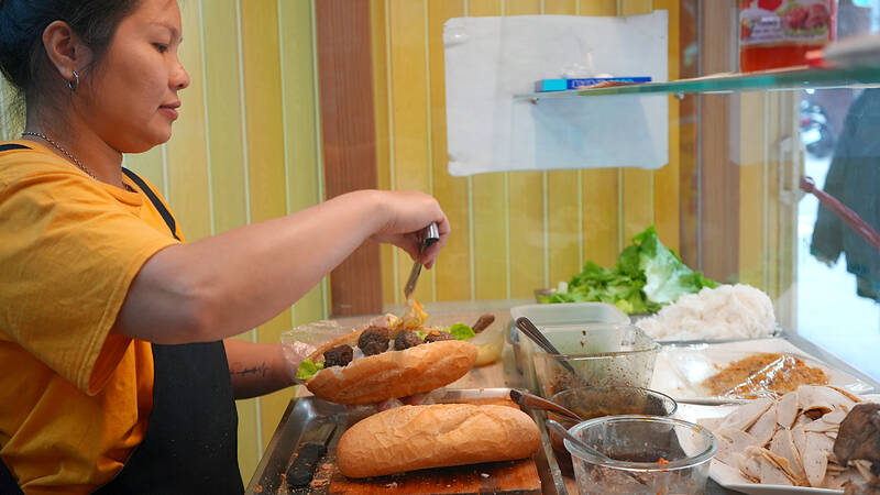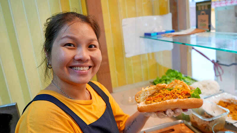 The restaurant is run by Huang Jin-chuan (黃錦泉), who is married to a local, and her little sister Eva, who helps out on weekends, having also moved to New Taipei City to study her for Master’s degree here. The pair serve up fresh sandwiches that keep the vibrant immigrant community in Jhonghe District (中和) lining up day after day.