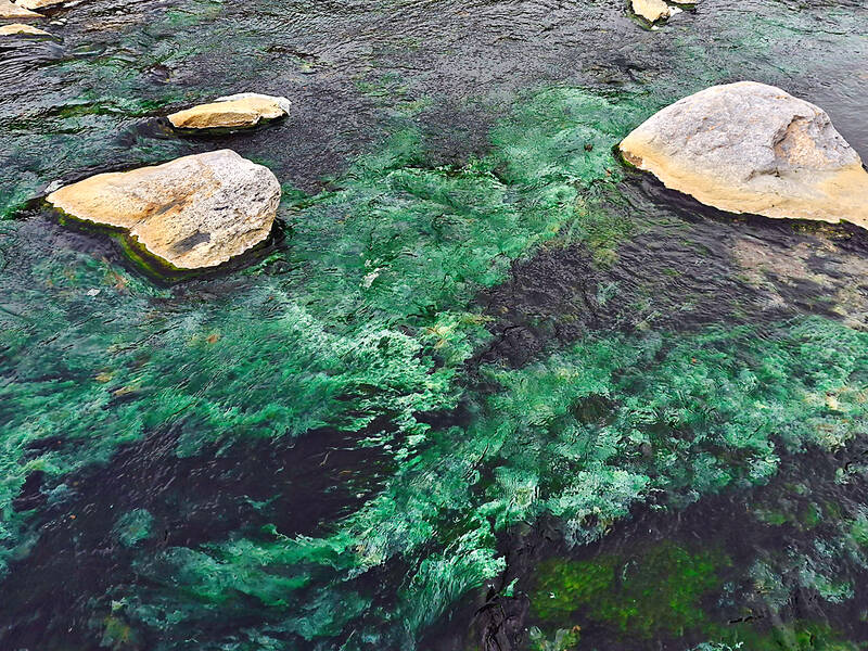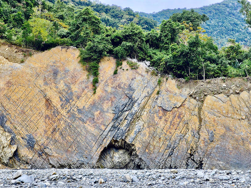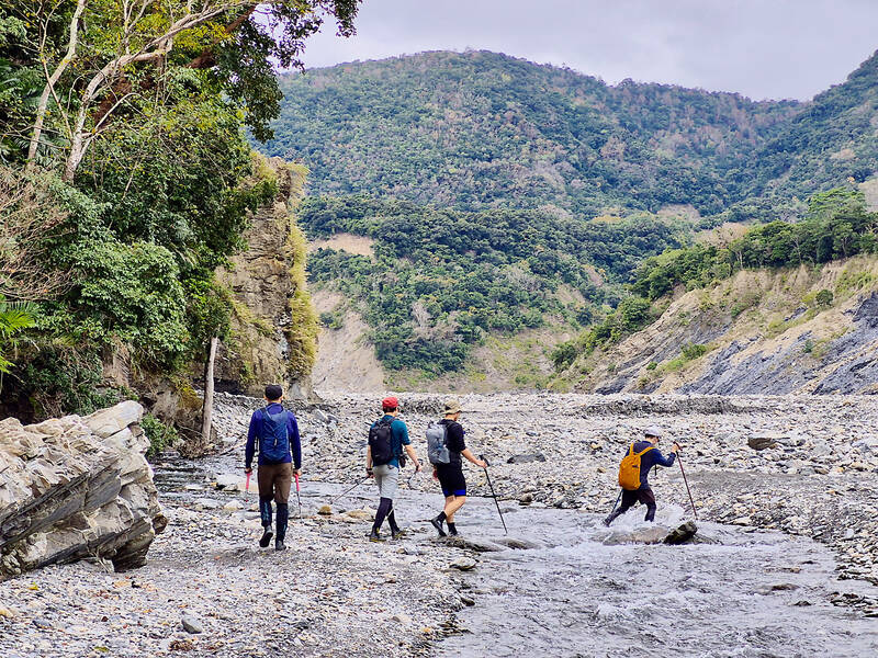 After about 2km, you will pass a spot marked as Jinhuang (近黃) on Google Maps just before a fork in the river. This is not the hot spring, but rather the location of an abandoned village of the same name settled in the Japanese era. Continue along the main river (left at the fork) for another 2km until the riverbed widens before another major fork. There is an unusual “false island” of treed higher ground surrounded by stony riverbed, the result of erosion by the river at a time when its course ran nearby.
