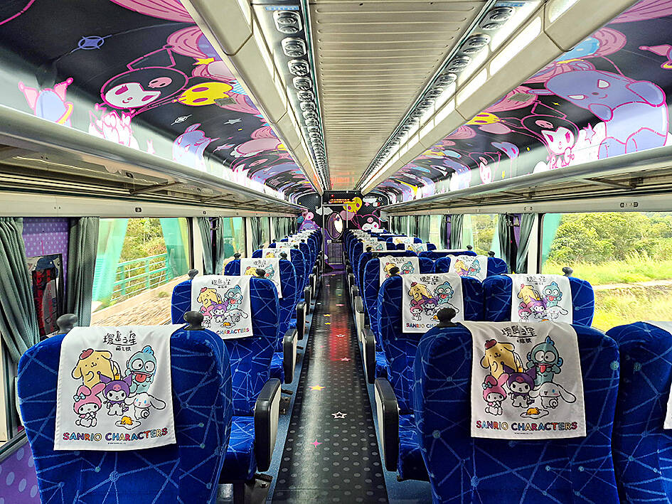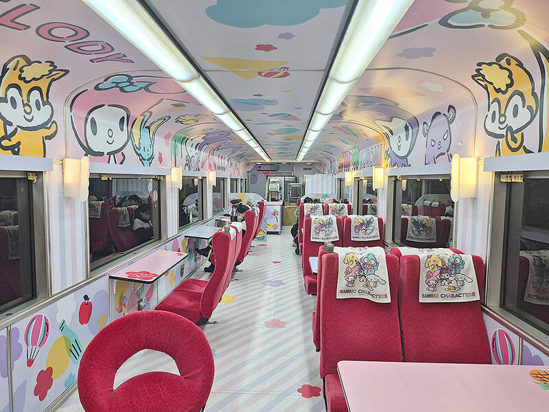 The passenger cars are each themed according to a different Sanrio character. Bright colors cover the floor, walls, seats and ceilings, in a style you might call either gaudy or cute, depending on how much of a Sanrio fan you are. There are only three seats per row — two on one side and one on the other — and there was enough room to fully extend my legs. Essentially, every passenger is getting what would be business class seats on an ordinary TR train.