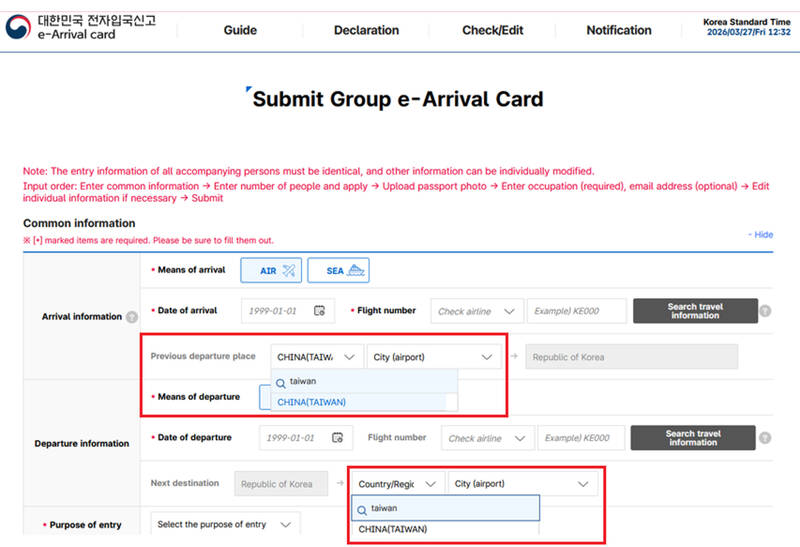 Both the country and “previous departure place” fields in the group or agency application are listed as “CHINA (TAIWAN)” on South Korea’s e-arrival card system.