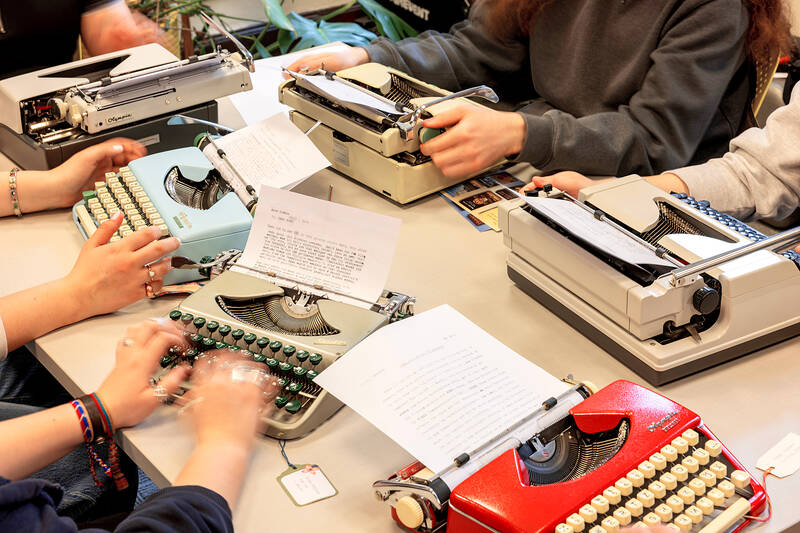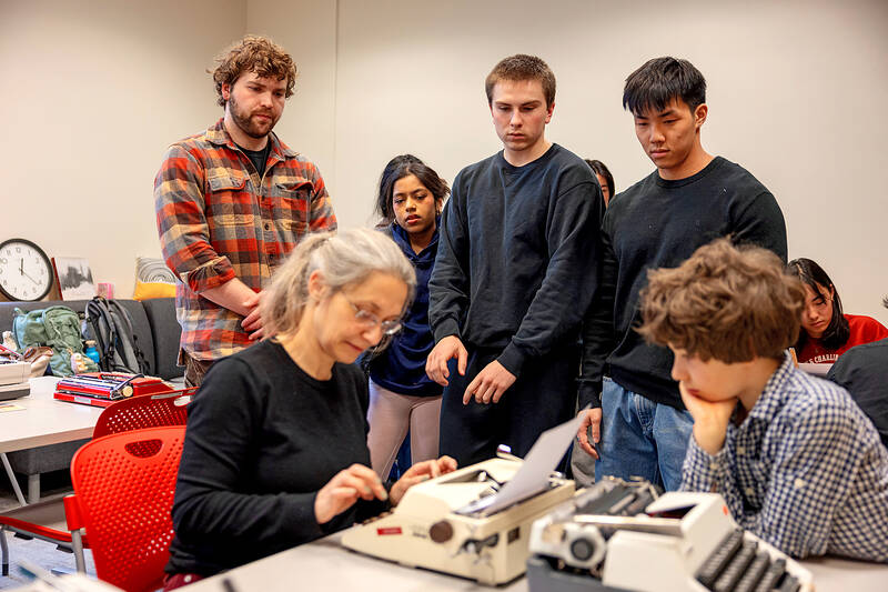 Students arrived for class on a recent analog day to find typewriters at the desks, some with German and some QWERTY keyboards.