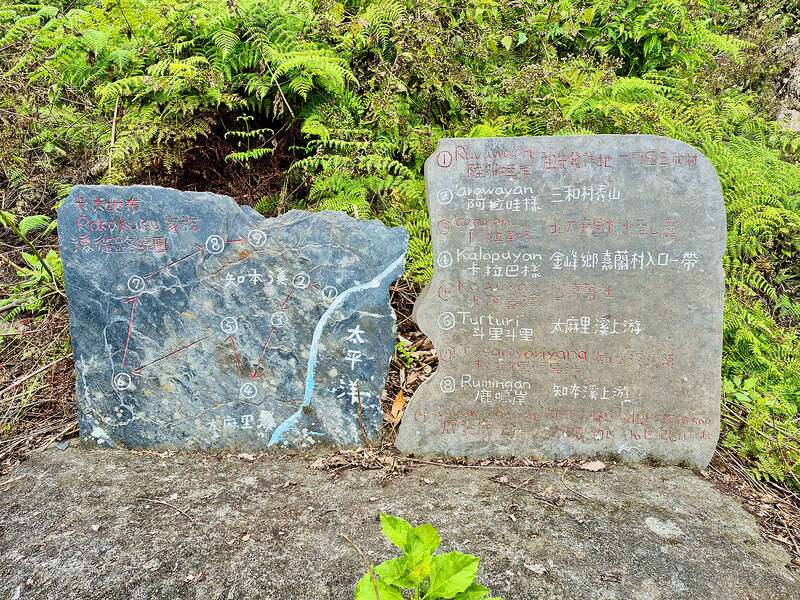 A wide swath was once cleared for this trail and it was built up with wooden stairs in places, but it has been unmaintained for what looks like a decade or two and is now only for the truly adventurous with an offline map on their phone. Follow the traces of this heavily overgrown path fifteen minutes uphill to reach a manmade platform with a once-sturdy railing and concrete paving stones, where you get an even better view of the Pacific. Inscribed stones here mark this as the former site of the Ruvaruvangan Beinan village, and document the historical locations of Beinan villages and the people’s migrations over the centuries. It’s unclear why the access to this memorial site has not been maintained.