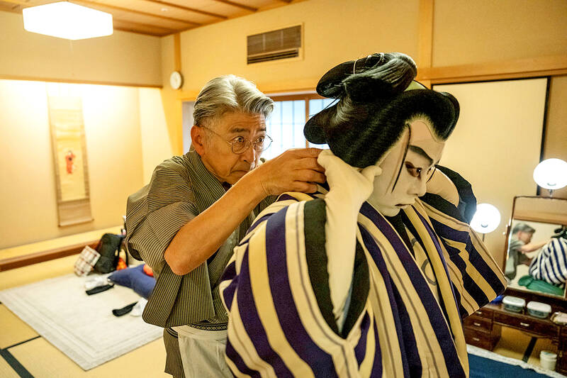Ahead of a show at the famed Kabuki-za theater in central Tokyo, wig master Tadashi Kamoji carefully places a topknot creation on a young performer in a flamboyant kimono costume.