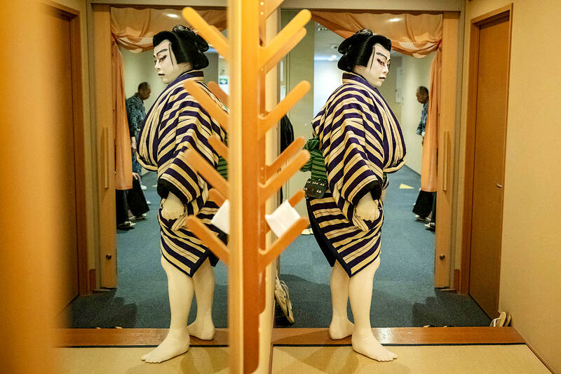 Backstage at the Kabuki-za theater, Tanenosuke covers his face in thick white foundation and his assistants help him pull on a large, navy-and-white striped kimono.