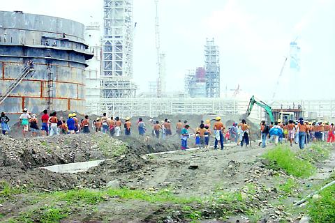 In an eight-hour long clash that lasted until 4:30am yesterday, hundreds of Thai and Filipino laborers fought with rocks, pipes and gasoline bombs at the Formosa Plastic Group's Sixth Naptha Cracker site in Mailiao, Yunlin County, injuring over 20 people. Four Filipino workers were hospitalized with severe head injuries and dozens of others suffered minor injuries in the brawl, police said. Two remain hospitalized late last night.