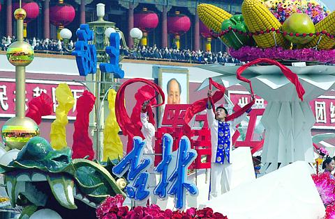 With a grand parade rolling into central Beijing yesterday morning, crowned by gleaming new missiles, shiny tanks and gaudy floats, China's leaders put together a show intended to project a jubilant manifestation of national strength and harmony. A temporary state of martial law in much of Beijing ensured that the event was cheered on by hundreds of thousands of pre-arranged onlookers.