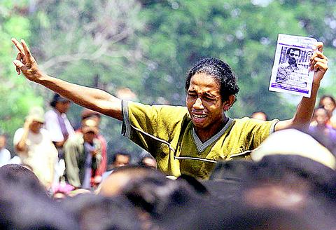 Many in the crowd wept with him, but jubilation predominated. People danced up and down with excitement, held up children to catch a glimpse of Gusmao, and waved the parasols they had brought to shield themselves from the blazing sun. Three old women pounded on homemade drums to celebrate.