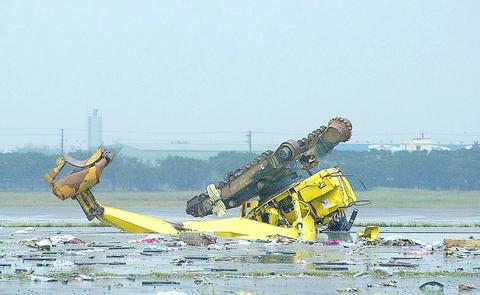 But a mark found on the grass definitely did not belong to the ill-fated jet, aviation officials said. The mark, they said, resulted from a minor accident involving a Mandarin Airlines (華信航空) plane a little earlier in the day.