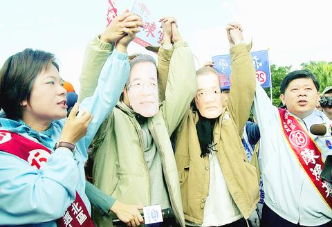 Impersonators of President Chen Shui-bian (陳水扁) and KMT Chairman Lien Chan (連戰), walked down a red carpet outside the Presidential Office for a conciliation handshake, escorted by the two KMT candidates who organized the protest.