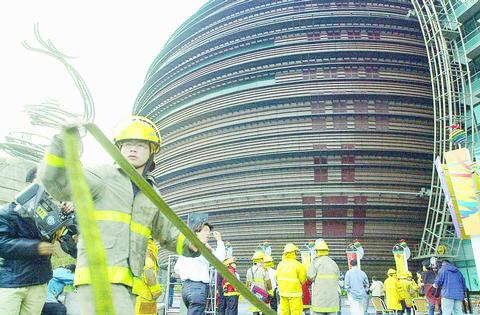 The Taipei City Fire Department deployed ladder trucks to put out the blaze as heavy smoke filled the 15-story, sphere-shaped shopping mall.