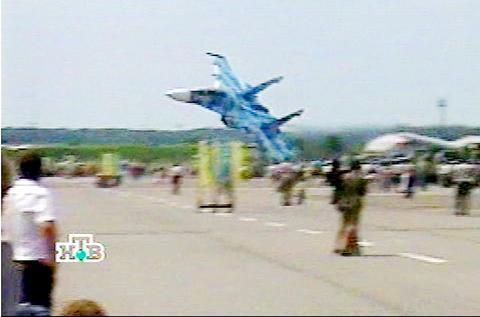 The SU-27 was in the sky performing low-altitude maneuvers when just before it hit the ground it went silent and banked left -- its wingtip shearing trees and touching another plane on the ground.