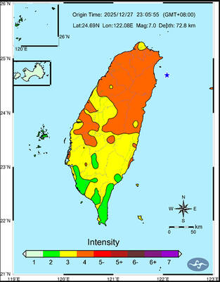 A magnitude 7.0 earthquake struck off Yilan at 11:05pm yesterday, the Central Weather Administration (CWA) said. The epicenter was located at sea, about 32.3km east of Yilan County Hall, at a depth of 72.8km, CWA data showed There were no immediate reports of damage. The intensity of the quake, which gauges the actual effect of a seismic event, measured 4 in Yilan County area on Taiwan’s seven-tier intensity scale, the data showed. It measured 4 in other parts of eastern, northern and central Taiwan as well as Tainan, and 3 in Kaohsiung and Pingtung County, and 2 in Lienchiang and Penghu counties and 1