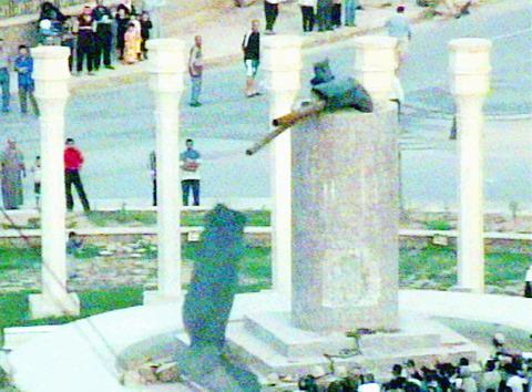 In other parts of the capital, Baghdadis tore up a giant portrait of Saddam, men brandished Kalashnikov rifles as they signalled their delight at the regime crumbling, while one white-haired man was seen laughing as he repeatedly hit at a poster of Saddam with a sandal.