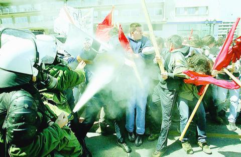 Outside the signing ceremony, held in the Athens' ancient Agora, demonstrations against the war turned violent as some protesters hurled gasoline bombs at police, burned banks and smashed storefronts. They also threw rocks at the British Embassy and attacked police in front of the American Embassy.