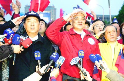 Taipei Mayor Ma Ying-jeou (馬英九), after hosting a separate flag-raising ceremony in front of the Taipei City Government, jogged to the Presidential Office for the national ceremony.