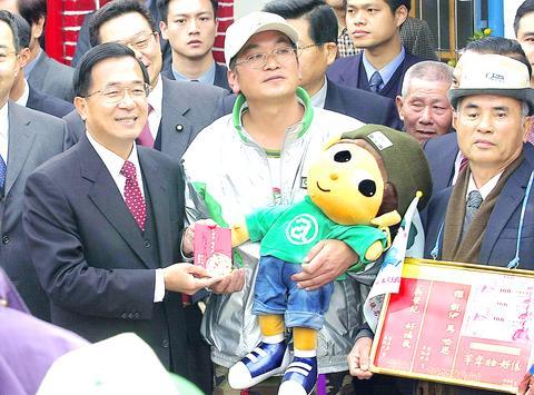 Over 20,000 red envelopes, bearing the words "great year, good luck," displaying the image of a monkey and with a new NT$10 coin attached, were handed out by Chen and his wife, Wu Shu-chen (吳淑珍).