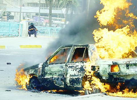 The blast on al-Rasheed Street set one building on fire and damaged seven cars, said Colonel Adnan Abdul-Rahman of the Interior Ministry.