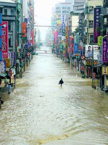 In nine affected areas, blasts of wind blew shop signs and street lights to the ground and damaged trees. In northern Taiwan, the water surface of the Tamsui, Keeling, Dahan and Sindian Rivers exceeded alarming levels. Accumulated rainfall from midnight on Sunday to 5pm yesterday exceed 300mm in many places in Taipei and Taoyuan Counties, as well as Taipei City.