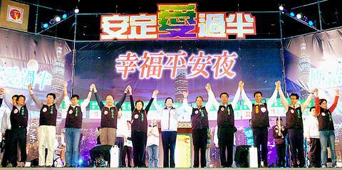 "Let's use love and democratic ballots to rewrite Taiwan's history," he added. "You have given the KMT a chance to dominate the legislature for more than 60 years. I hereby appeal to you to let the pan-green camp have a chance to be a majority in the legislature and carry out work to serve you all."