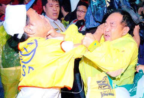 The airport lobby became a battlefield when supporters of the Taiwan Solidarity Union (TSU) and the New Party broke through the security cordon set up at a checkpoint inside the departure area.