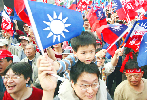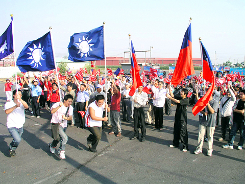 Amid deafening drumbeats and whistles, Chinese Nationalist Party (KMT) Chairman Ma Ying-jeou (