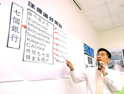"The six companies are Euromax, Middlebury, Bacellatie, Sableman, Kilkenny and Cathay. They opened 42 bank accounts in seven banks, giving about NT$17 billion [US$523.4 million] in kickbacks," Hsu told a press conference organized by the lawmakers.