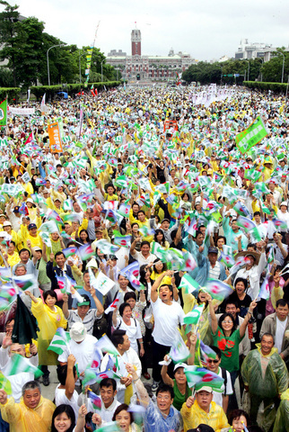 Despite the rain brought by Typhoon Shanshan, organizers said more than 200,000 people attended yesterday's rally in front of the presidential palace organized to counter the demonstration aimed at ousting President Chen Shui-bian (陳水扁).